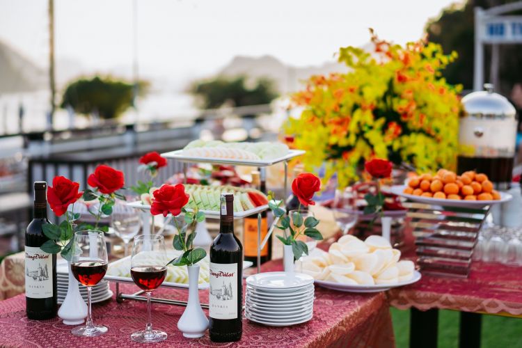 12:30: Enjoy a special lunch with more than 30 dishes on the boat.While having lunch, the boat will pass by the beautiful scenery on both sides with thousands of limestone such as Fighting Chicken and Incense Buner Islets – 2 symbols of Halong Bay