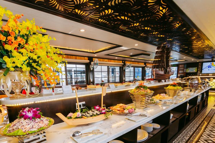 12:30: Enjoy a special lunch with more than 30 dishes on the boat.While having lunch, the boat will pass by the beautiful scenery on both sides with thousands of limestone such as Fighting Chicken and Incense Buner Islets – 2 symbols of Halong Bay