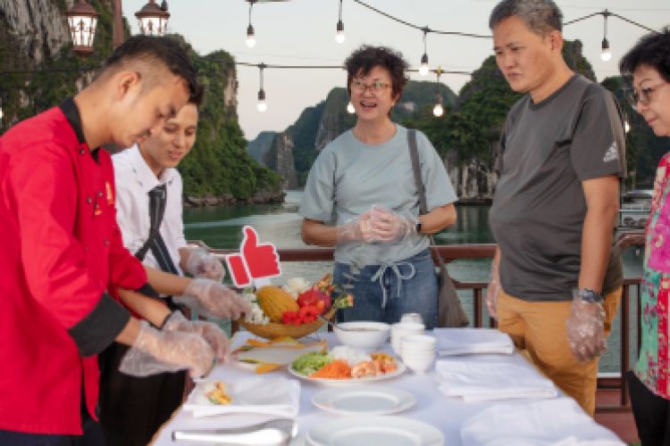 Cooking Demonstration is an onboard activity that helps passengers not only to sample fine cuisine but also learn more about Vietnamese culinary culture. Cruise Chef will show and guide you on how to make Vietnamese traditional dishes such as fresh or dried springing rolls and/ or how to carve different kinds of vegetables and fruits.